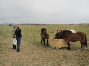 The girls say hello to the small Icelandic horses