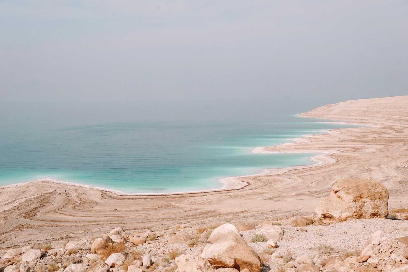 Our drive to Wadi Rum, however, was still very rewarding. This was really the first time we were seeing Jordan in the daylight and we were surprised and delighted to see camels just casually along the sides of the roads, both owned and wild camels. We saw farmers tending to their goats and sheep. People just going about every-day life in Jordan. Our favorite part of the journey, however, was the beautiful and surreal scenery along the Dead Sea Highway. We had seen in it photos, but in several places the white dirt and landscape marry the salt water and form these beautiful turquoise rings that disappear into the deep blue water.